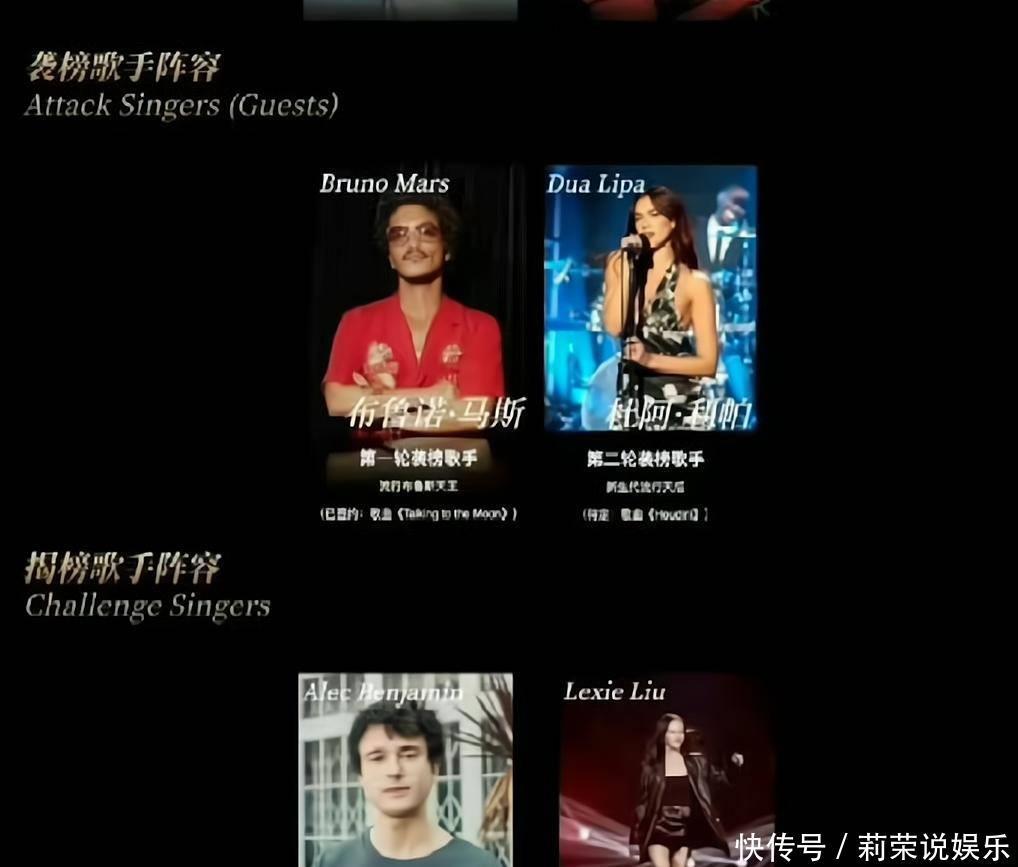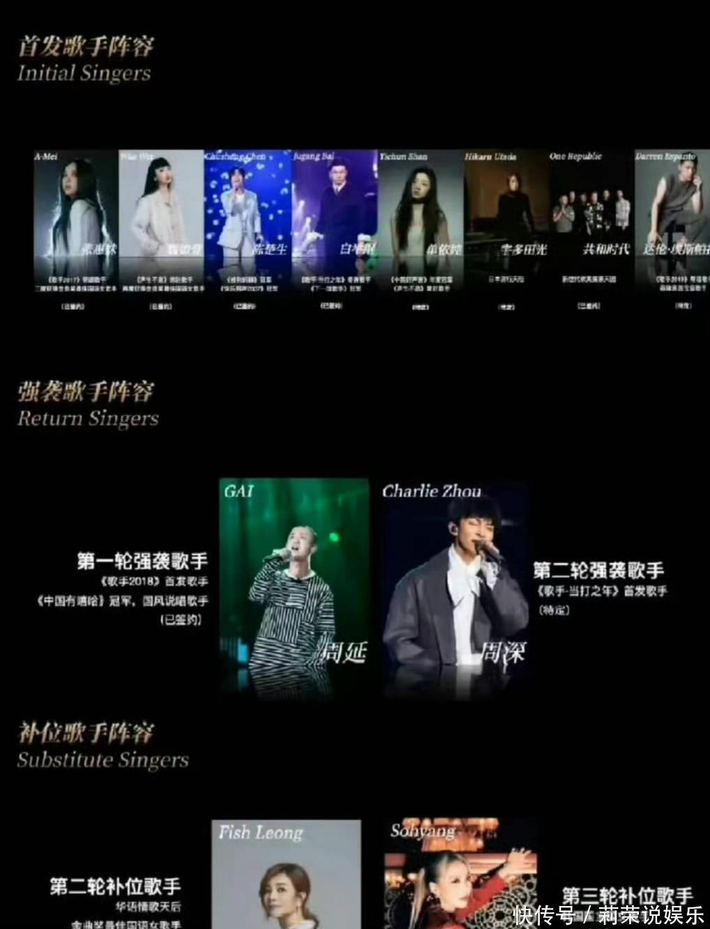 强袭歌手是周深个GAI,补位歌手是梁静茹和金昭享,袭榜歌手是火星哥和啪姐,揭榜歌手是阿力克本杰明和刘伯辛。