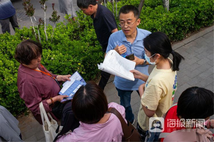 《高科场外的特殊时光》2023年6月7日,济南第三中学科场外,考生期骗进科场前的顷然时光进行温习。王剑 摄