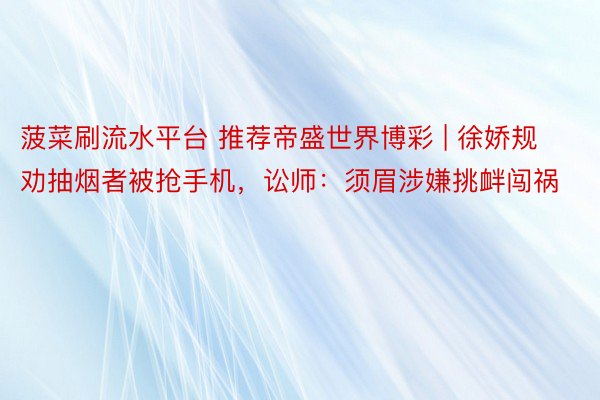 【#徐娇规劝抽烟者被抢手机#,讼师:须眉涉嫌挑衅闯祸】12月26日中午,演员徐娇发微博称:“在长沙的一家餐厅遭逢一位抽烟的男士,让处事员规劝后仍放话‘我把这支抽完’,我躬行规劝后,这位先生叫嚣‘这里又莫得贴禁烟记号’,在试图录下凭证的工夫,这位先生抢走我的手机,并径直把烟头扔在了我的饭碗里。”